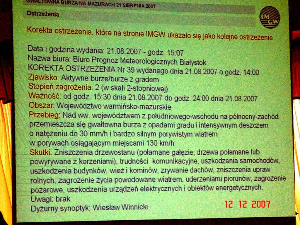 Co do samych wystąpień - pierwsze była naprawdę ciekawe - pracownicy biura Instytutu Meteo, którzy przedstawili animacje na bazie przetworzonych zdjęć satelitarnych pokazującą całościowa sytuacje przed i po burzy nad Polską w dn. 21 sierpnia, kiedy to z małej chmury, która powstała w płd.- wsch. Polsce rozbudowała się chmura burzowa o ogromnych rozmiarach.