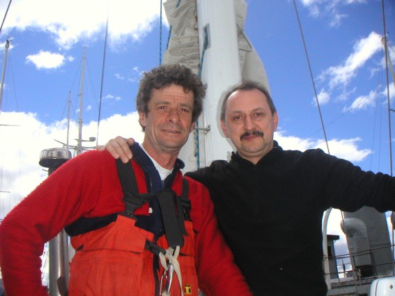 Dalej Puerto Williams. Wita nas i przyjmuje do burty Christophe Auguin – znany żeglarz francuski, który na jachcie „Geodis” w regatach Vendee Globe w 1997 roku ustanowił rekord przejścia 22.500 nm (w tym Hornu) w czasie 105 dni. Gratulacje od takiego Mistrza – to się liczy! Ten człowiek niewątpliwie wie, co znaczy żeglowanie w tamtych rejonach.
