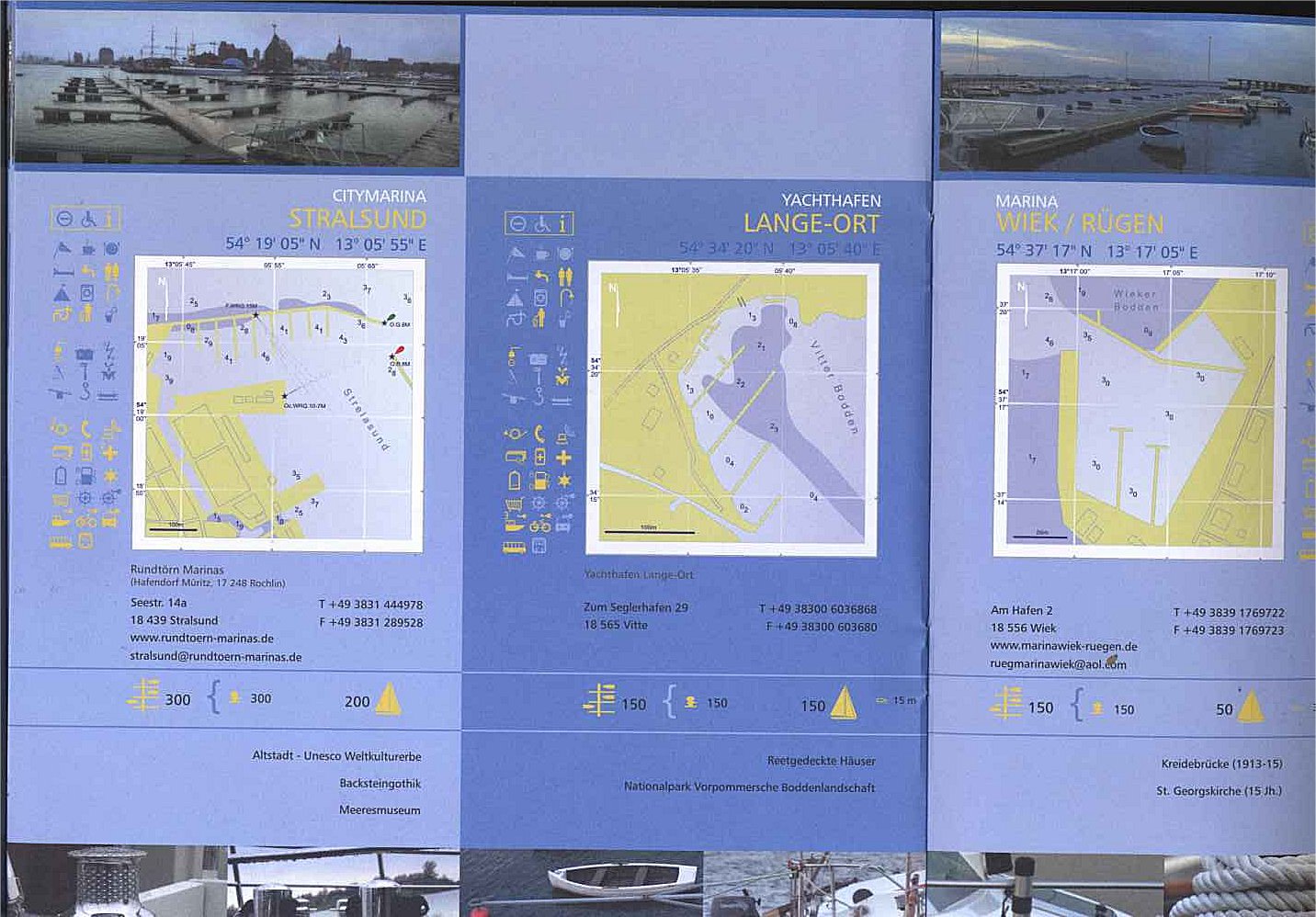 Andrzej Jamiołkowski podarował mi (dziękuję !) takie jakieś dziwne wydawnictwo. Nazywa się to - INFORMATIONSBROSCHURE UBER HAFEN, ANLEGSTELLEN UND MARINAS IM DEUTSCH-POLNISCHEN TEIL DER EUROREGION POMERANIA. Zeszyt ma format przedziwny 205 x 205 mm, liczy sobie 51 stron, nie ma indeksu, kolory fatalne, teksty na niektórych aplach - prawie nieczytelne, plany portów super prymitywne, informacji nautycznych i turystycznych - brak. Nie bardzo wiadomo - co to takiego: folder turystyczny, locja żeglarska ... ? Nie mogę też domyśleć się adresata.
