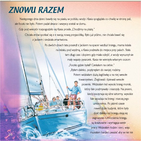 Gawęda jest wciągająca, a że opatrzona pięknymi, kolorowymi obrazkami - zasługuje aby żeglarscy rodzice, a zwłaszcza dziadkowie zainteresowali się tą książeczką. Na co zwróciłem uwagę ? Po dziesięcioleciach wpychania do ksiazek dla dzieci awangardowych, "artystycznych" bohomazów (czy to "cy to kupa gnoja, cy dziewucha moja?") wreszcie mamy powrót do rysunków "normalnie apetycznych". Piotr Łukaszewski pokazał na czym to polega. Brawo!