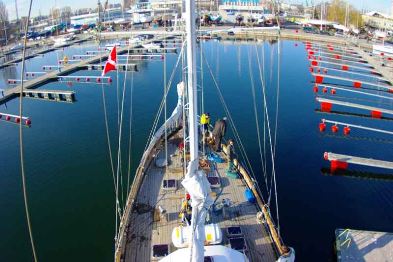 W sobotę mieliśmy lekki wiaterek z zachodu i kursanty były mocno zdziwione, że statek pływa bokiem i bardzo trudno obrócić go dziobem pod wiatr w ciasnym basenie. Brak typowej dla jachtów płetwy balastowej sprawia, że Zjawa nie ma się wokół czego obracać. W porównaniu z nią Opal obraca się jakby był przybity wielkim gwoździem do dna basenu.