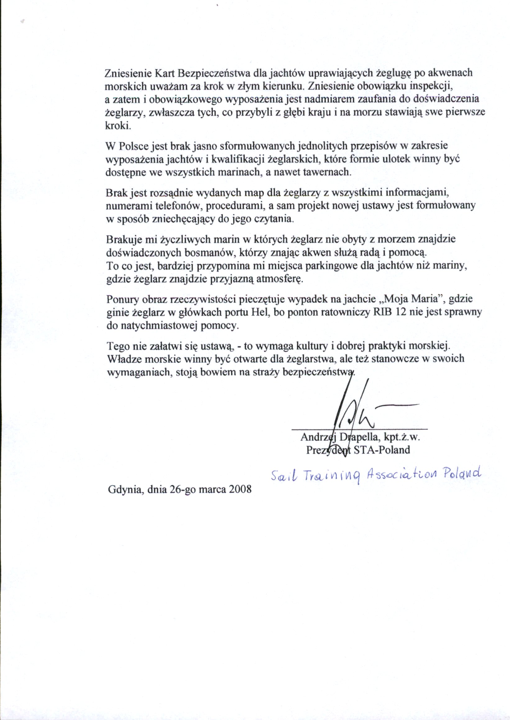 Pięknie Pan to wszystko ujął i pewnie ze wszystkim możemy się zgodzić - za wyjątkiem tego, zacytowanego powyżej zdania z pańskiej wypowiedzi. Co Pan Kapitan Drapella chciał przekazać jest czarno na białym czytelne powyżej naszych komentarzy i wszystko to jesteśmy w stanie zrozumieć i właściwie zinterpretować, a zrozumieliśmy... już Pan wie, co i jak. Mamy na temat tego, oficjalnego pisma Prezydenta STA Poland, z uwagami do projektu ustawy, odmienne zdanie niż pańskie... i pewnie przy tym zostaniemy, bo trudno teraz wykręcać, co chciał Pan Kapitan Drapella napisać, ...skoro wszyscy widzą, co napisał.