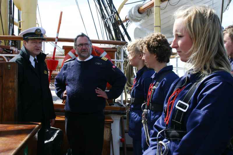 - miło mieć takich gości. Już na pierwszy rzut oka widać że statek jest doskonale prowadzony i idealnie utrzymany. Załoga szkolna jest zdyscyplinowana. Oficerowie i instruktorzy są młodzieży przyjaźni. Nie ma tu zbytecznego dystansu między przełożonym a podwładnym. Panują bardzo demokratyczne stosunki. Tu czuje się, że ta załoga ma nie tylko obowiązki, ale i prawa. Jest zakaz palenia papierosów, można jednak zapalić fajkę na pokładzie. Jest zakaz spożywania napojów alkoholowych. W tym przypadku panuje piłkarska zasada 2 żółtych kartek. Po czerwonej trap dla winnego przekroczenia dobrych obyczajów jest zamknięty.