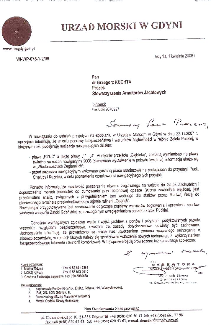 Informacja, jaka dotarła do nas wczoraj, wprawiła nas w stan ambiwalencji (przepraszam!) a jednocześnie szukaliśmy w niej jakigoś odniesienia do "Prima Aprilis". No, bo z jednej strony poprawa bezpieczeństwa dzięki wymianie pław w "Głębince" na pławy świetlne, uaktualnienie oznakowania torów podejściowych do Kuźnicy czy Pucka a z drugiej strony dość enigmatyczne informacje o zmianach w rejonie wejścia do Górek Zachodnich, o tworzeniu systemu wczesnego ostrzegania o niebezpieczeństwie oraz o zachowaniu wymagań odnoszących się do MELDOWANIA wejść i wyjść jachtów z portów i przystani. Mimo wszystko jednen fakt jest pozytywny. Urząd Morski w Gdyni wie z kim rozmawiać o sprawach dotyczących bezpośrednio nas, żeglarzy. Jeszcze kilka spotkań, jeszcze będziemy musieli parę razy "podreptać" do UM i Traktat zostanie podpisany...eee to znaczy, Urząd Morski będzie podejmował dalsze działania ułatwiające uprawianie żeglarstwa, poczynając od dobrego oznakowania i organizacji a kończąc na odstąpieniu od wymagań powodujących niepotrzebny ruch w eterze.