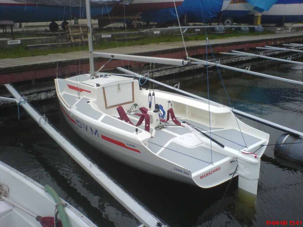 W sobotę 19.04.2008 Jachtklub Morski NEPTUN gościł swego przyjaciela Piotra Adamowicza, który i tym razem uświetnił naszą przystań wodowaniem i próbami technicznymi swego najnowszego wodnego bolidu regatowego, czyli jachtu Klasy "ŻAGLE 500" o zagadkowej dla mnie nazwie "D V M" (POL 7119). Jest to drugi jacht taj klasy typu CORS 500 nr bud. 3, konstrukcji mgr inż. budowy okrętów Piotra Adamowicza. W porównaniu z prototypem kadłub jachtu jest z negatywowej formy (burty przekładka, dno na włókninie Firet, pokład, zabudowa wnętrza to 100 % przekładka wykonana najbardziej pracochłonną metodą "ONE-OFF". Budowniczym był osobiście konstruktor przy wydatnej pomocy stoczni MARE w Cedrach Małych pod Gdańskiem.