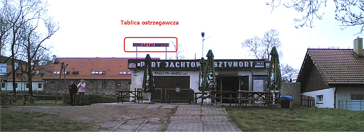 Wtedy, gdy gościliśmy w Sztynorcie wyświetlano ostrzeżenie przed burzą i silnym wiatrem. Na skraju panelu pulsowały żółte diody świecące, ale widoczność tego sygnału, jak i przesuwającego się komunikatu, była mizerna. Pomijam celowość ustawienia tablicy w porcie, niewidocznej zupełnie z jeziora. Ale mam poważne wątpliwości, czy ktoś, kto nie jest w stanie dostrzec czarnej chmury na niebie, będzie w stanie dostrzec tablicę ostrzegawczą i wyświetlany komunikat. A to przecież dla takich żeglujących miały być te ostrzeżenia. Bo dla tych którzy obserwują niebo, takie ostrzeżenia nie są potrzebne.