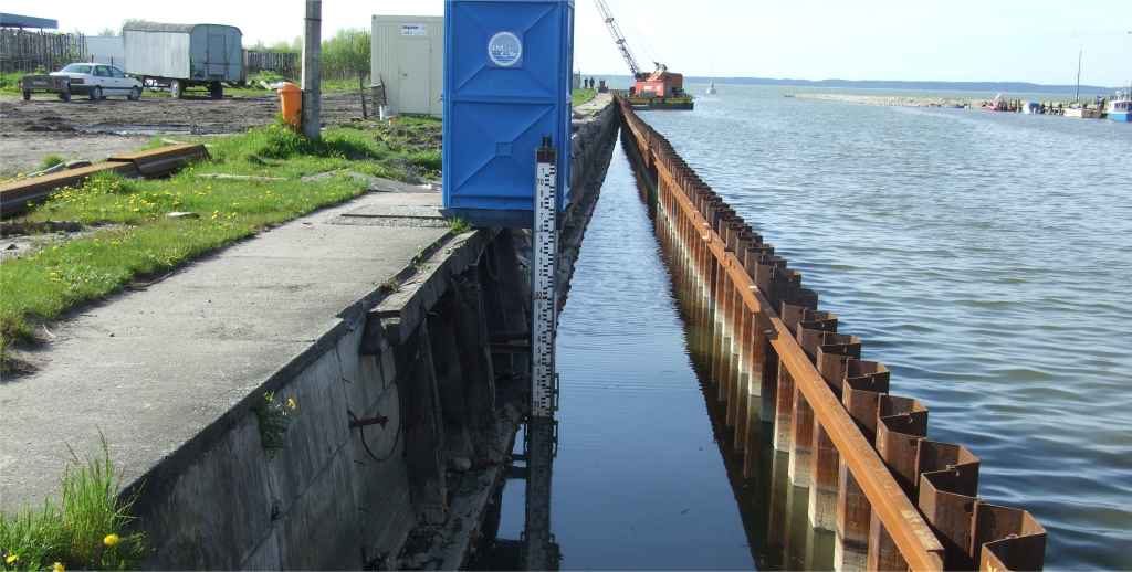 Tolkmicko - nabrzeże przed nabrzeżem (budowa). Na pierwszym planie budka pomiarowa IMiGW