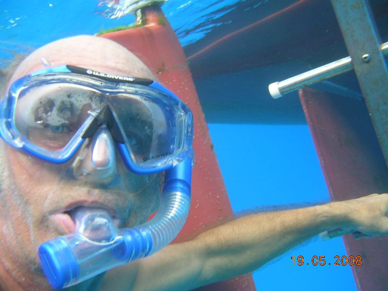 Rafa za gleboka do nurkowania , woda nie za bardzo przezroczysta ( moze widac na trzy metry ) trzeba szukac lepszej laguny . Z wypluwajacym pradem chcemy wyplynac rano do nastepnej moze lepszej laguny ,a tu problem kotwica nie che wyjsc do gory , winda nie wyrabia , dziob sie chce wcisnac pod wode a kotwica ani drgnie. Poltorej godziny walczymy z kotwica , zaczepilismy jakies podwodne liny z ogromnymi kamiennymi ciezarami i w koncu mamy je 2 metry pod dzobem ( dzieki ci za wypornosc "Maciejka" ) zakladamy nasza 2/4 cala line pod tamte i knagujemy na dziobie ,opuszczamy lekko kotwice i podjezdzamy do przodu , kiedy kotwica jest wolna puszczamy nasza line z jednej knagi ktora ze swistem wpada do wody i przelatuje pod lina z kamiennymi blokami , cale to ustrojstwo idzie na dno , dopiero w nastepnej lagunie dowiemy sie cos my zaczepili.
