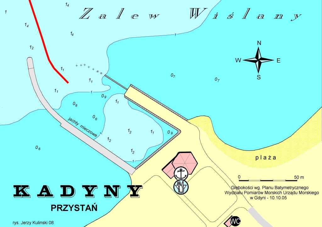 Dla wybierających się na Zalew Wiślany mam planik przystani jachtowej w Kadynach. Rysunek chyba unikalny - przystań pomierzyłem na przełomie maja i czerwca. Tylko sondaż jest starszy. Dziękuje panu Henrykowi Koszka za jego udostępnienie.