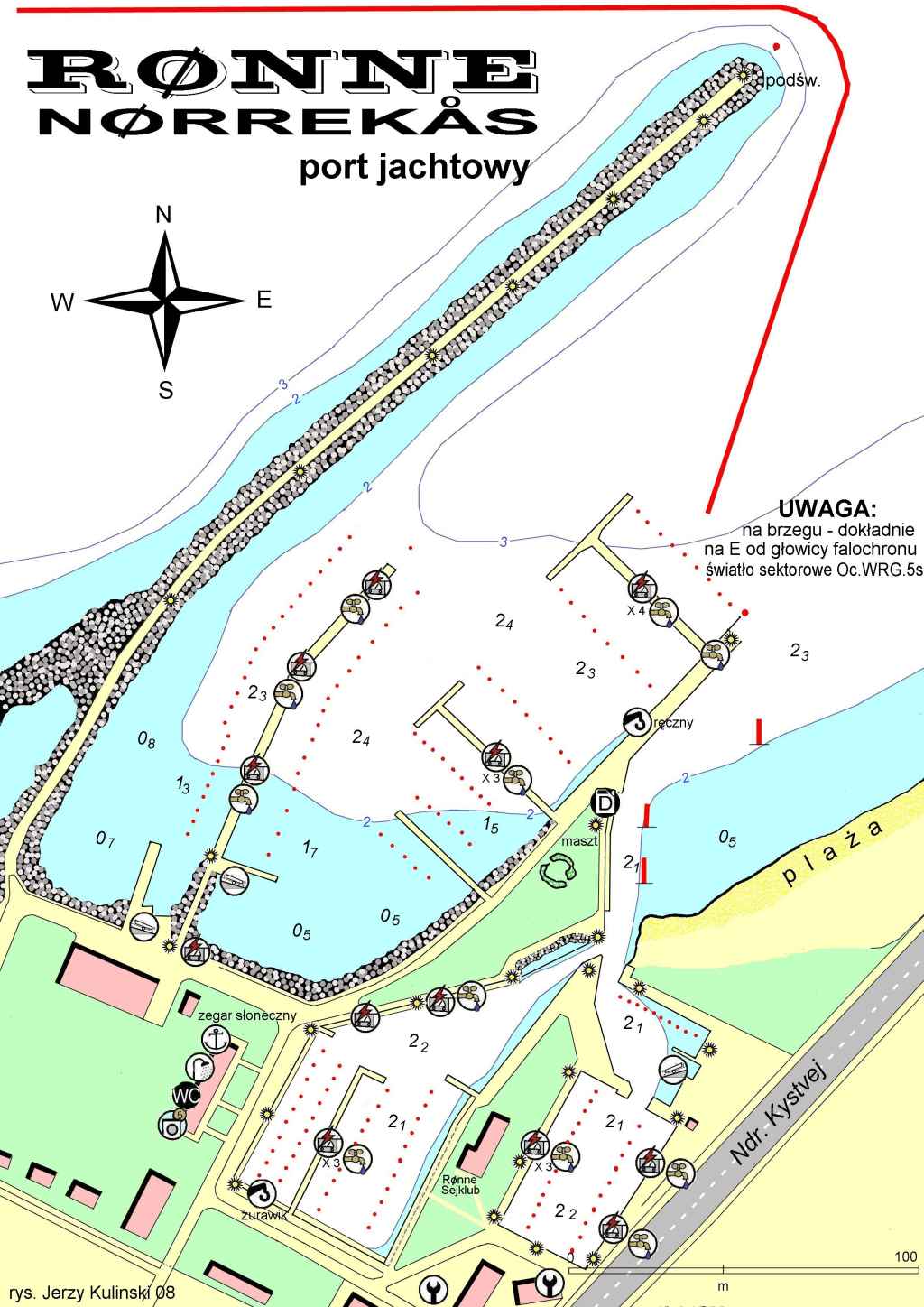 Lipiec, Bornholm czeka. A więc po dwóch małych porcikach (Boderne i Bakkerne) podrzucam wam planik sporego bornholmskiego portu jachtowego - Norrekas. Z tej przystani najblizej do centrum Ronne. Na co zwracajcie uwagę? Na światło sektorowe, na podświetlenie głowicy i iluminację falochronu, na "muzeum polerów" i portowy zegar słoneczny. Nie czekajcie na bosmana tylko niezwłocznie po zacumowaniu opłacajcie postój kartą kredytową (automat). Opłaty: 120 DKK do 9,99m i 150 DKK do 12,99 m. Bosman urzęduje w "kabinie kontroli rejsów" na dachu pawilonu sanitariatów. W pobliżu przystani znajduje się duża wypożyczalnia rowerów oraz supermarket.