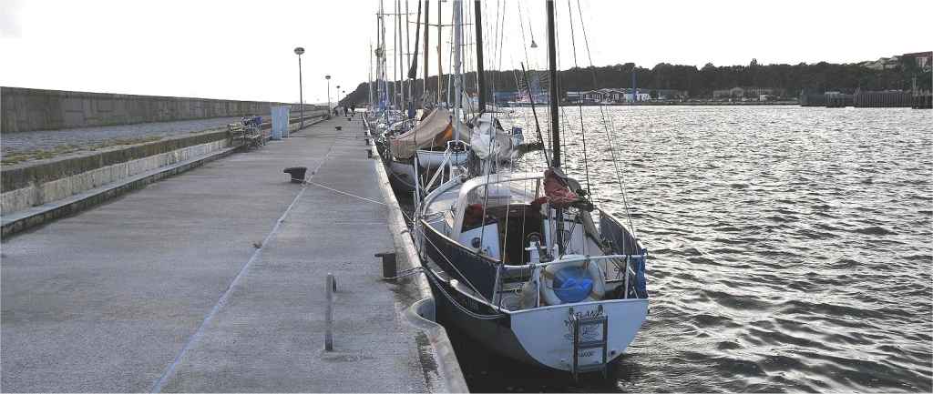 Płynąc od strony Kanału Kilońskiego, po odwiedzeniu małej dziury o nazwie Gedser(Dania) postanowiliśmy po opłynięciu Arkony wejść do Sassnitz. Po latach odprawiania sie do mitycznego i legendarnego Sassnitz stwierdziliśmy, że będąc tak blisko ,grzechem byłoby nie wejść i nie zobaczyć jak wygląda ów port. Wchodziliśmy tam w strugach ulewnego deszczu( jak w całym rejsie) i przy wietrze 7B, port jest dość bezpieczny i daje dość dobrą osłonę od wiatrów i falowania. Niestety pozatym trudno powiedzieć o nim coś dobrego. Stoi sie przy falochronie na oponach langside, lub dziobem do falochronu na dalbach z rufy. W czasie naszego pobytu wszystkie miejsca z dalbami były zajęte, a i wiatr zachodni o sile 6-7B nie bardzo zachęcał do manewrów parkowania miedzy ciasno poupychane jachty, o drugiej stronie cała masa pomostów z y-bomami, niestety wszystkie ogrodzone biało-czerwoną taśmą i znakami "verboten". Dlaczego? pojęcia nie mam. Socjal dla żeglarzy pod psem. Do toalet ok. 1km marszu dookoła całego portu( jest co prawda ponoć kibelek gdzieś bliżej , ale nam sie nie udało go odkryć, pozatym bez prysznica), oczywiście 0.5 euro za siusianie, 2 euro za prysznic.