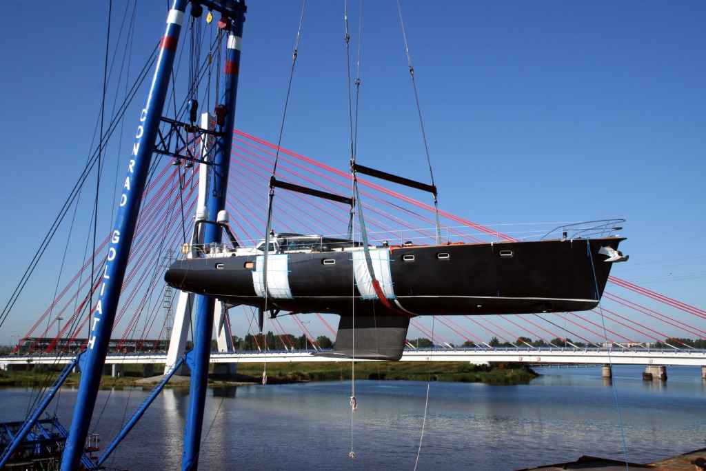 Zajrzyjcie do newsa "Stocznia Conrad S.A." z dnia 20 maja tego roku. Pisałem tam o budowie 18 metrowego jachtu aluminiowego. Zamieściłem też kilka fotek, które pstryknałem w hali. Za pośrednictwem kpt. Mariana Lenza (wreszcie wrócił do kraju) podrzucam wam przesłana przez Prezesa Mikołaja Króla aktualną fotografię owego jachtu w całej okazałosci. Jacht jest prawie gotowy. Planowane finalne wodowanie będzie miało miejsce w pierwszym tygodniu września po stoczniowej przerwie urlopowej. Wodowanie techniczne odbyło się 22 lipca.
