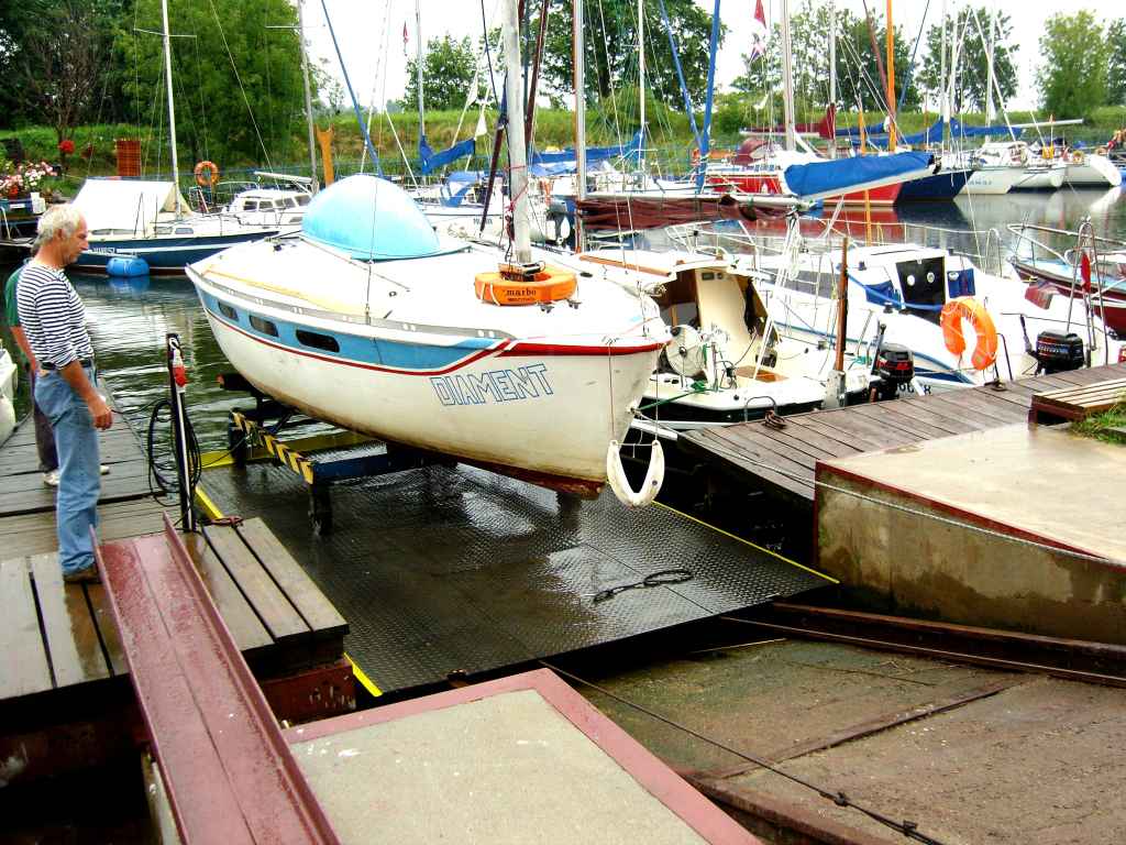 Przeszło 20 lat temu Stefan Wysocki wydał za pieniądze państwowego wydawnictwa broszurę reklamującą prywatnego przedsiebiorcę. Tytuł broszurki - "Rodzina Maków". I tam wtedy zobaczyłem szuwarową maszyne regatową "MAK 707 GTK". A teraz po tylu latach miałem okazję obejrzeć ów jachcik w "realu" (ach ta nowomowa!). Miałem więc okazję pewnego deszczowego dnia asystować w wyciaganiu "Diamenta" z wody na naszym podnosniku. Specjaknie pisze podnośniku, bo genialna, unikatowa konstrukcja Henryka Brylskiego bardziej przypomina synchrolift niz wyciąg. Warto abyscie przyjrzeli sie jak wygodnie i bezpiecznie przebiega taka operacja. Przy okazji popatrzcie na "kanał obsługi mieczy" (po lewej stronie). Na tym stanowisku skrobie się i maluje oraz wymienia nadwątlone stropiki mieczy sektorowych.