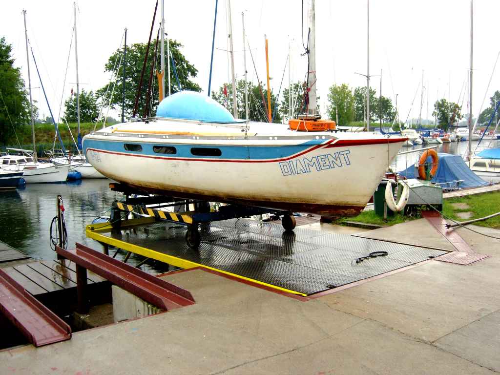 Załoga przygotowuje jacht do przeładunku z wózka na przyczepę samochodową (w tle bramowniczki- niebieska i żółta)