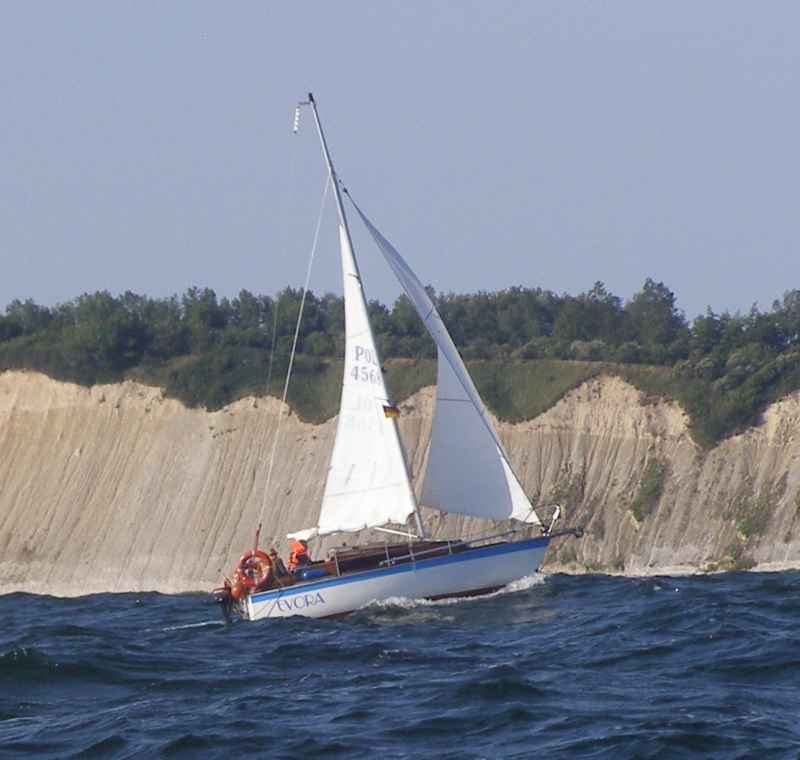 Witka, naszego kolegi klubowego, który w tym samym czasie i miejscu płynął swoim 6 m jachtem EVORA do Świnoujścia. Jacht Witka to dzielna łódka zbudowana na laminatowym kadłubie Obłoczka ale pokład i nadbudówka wykonana solidnie z drewna. Tego dnia kiedy znajdowali się na Roztoce Zalewu Szczecińskiego zauważyli za rufą walczący ze szkwałami (wiało