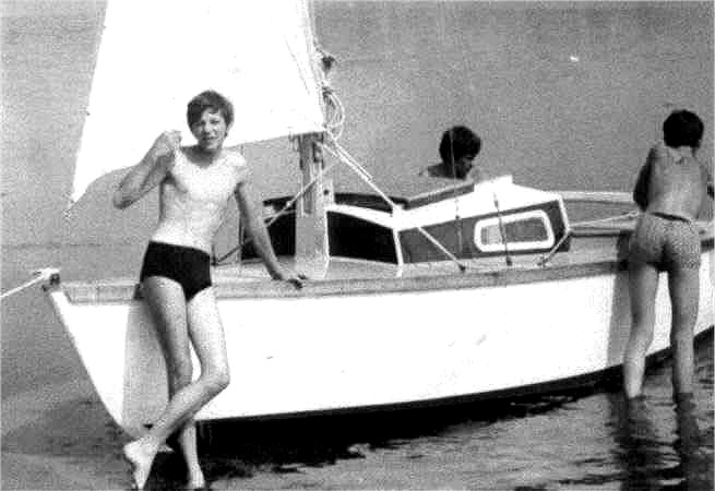 Powyżej zamieszczam wycinek z otrzymanej od Piotra fotografii. Jest rok 1969, ten chudzina na pierwszym planie to własnie Piotruś, a za nim jego pierwsza, własnoręcznie zbudowana łódka. Przypominam - rok 1969, czyli czasy, kiedy o każdy metr sklejki, o każdy miedziany gwożdzik czy mosięzny wkręcik, o jakikolwiek wodoodporny klej czy kawałek plexi było niesłychanie, niesłychanie trudno. W tych latach samemu wypiłowywało się knagi, kluzy i kleciło bloczki ... Jeszcze raz przyjrzyjcie się temu chłopcu na fotografii....